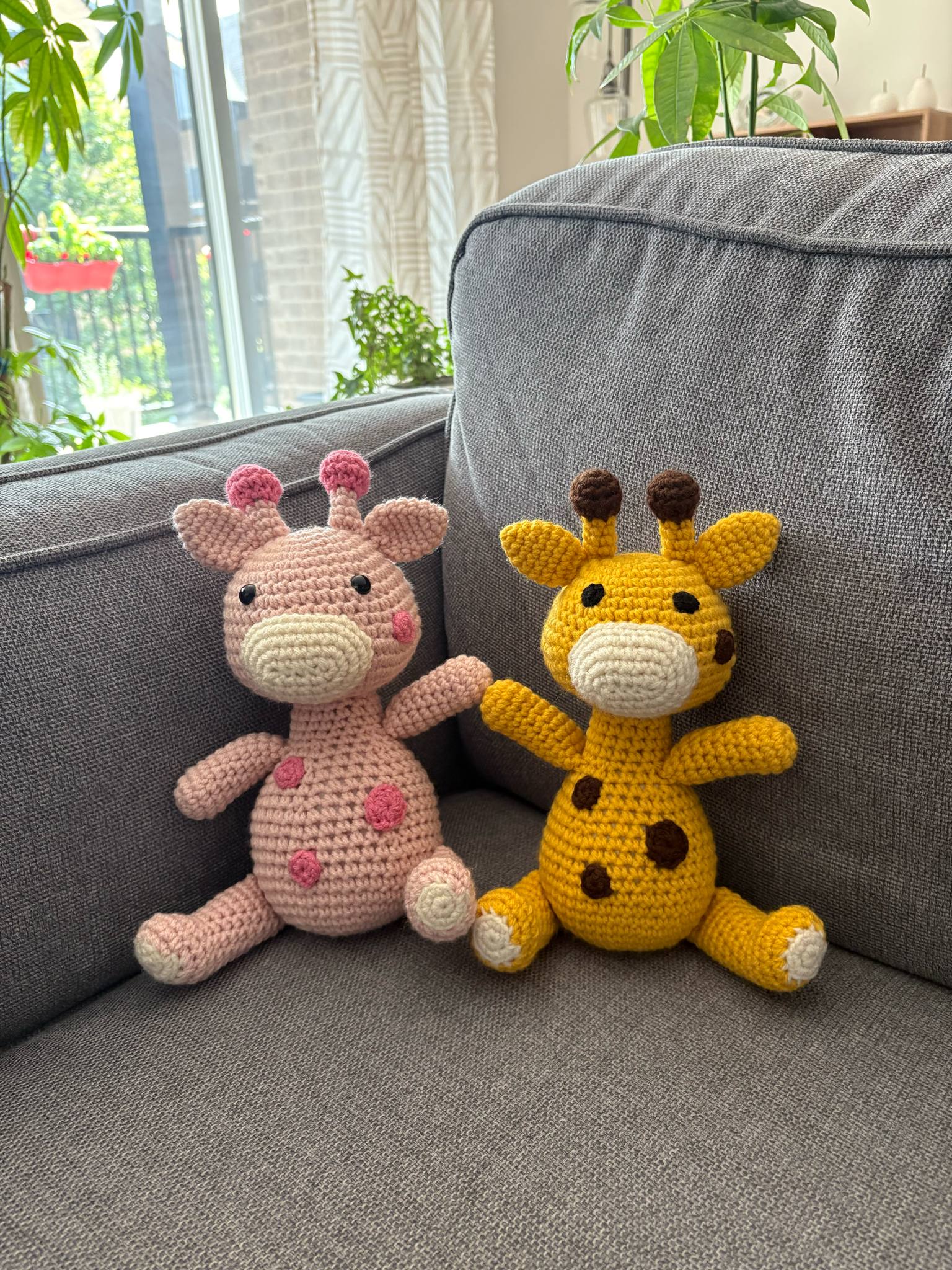 These adorable crochet giraffes are full of personality and handmade charm! Each one is crafted with acrylic yarn, gentle stuffing, and lots of love. Choose between a classic yellow giraffe or a playful pink one โ both are perfect for gifting, decorating, or adding to your own crochet critter collection.